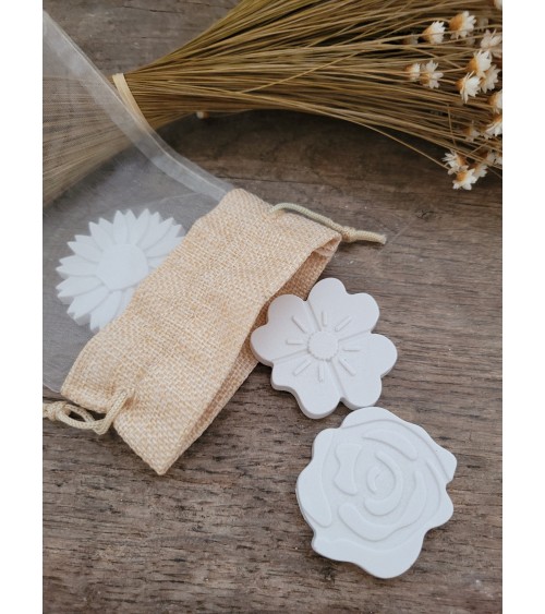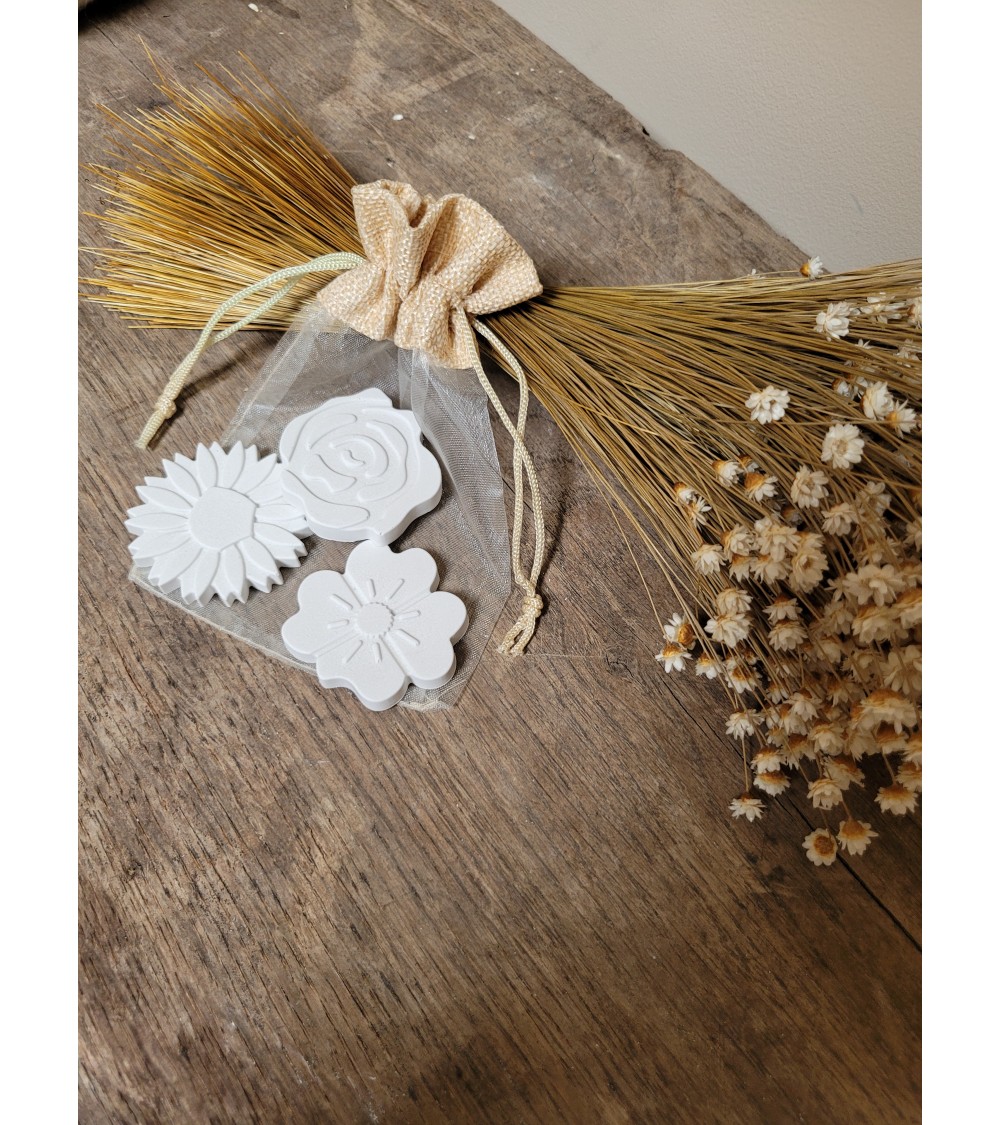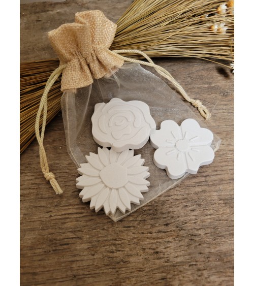 Pochon en voile & lin renfermant 3fleurs en plâtre parfumées