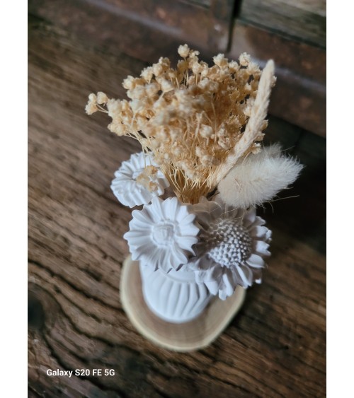 absorbe le parfum par capillarité à travers le pot-les tiges de roseaux et les fleurs , libérant ainsi de discrètes effluves en continu et durablement*