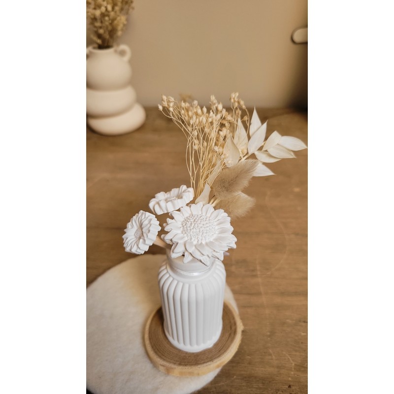 Attendre que le parfum s’imprègne par capillarité à travers le vase et les tiges de roseaux ornés de plâtre, libérant ainsi un doux parfum.