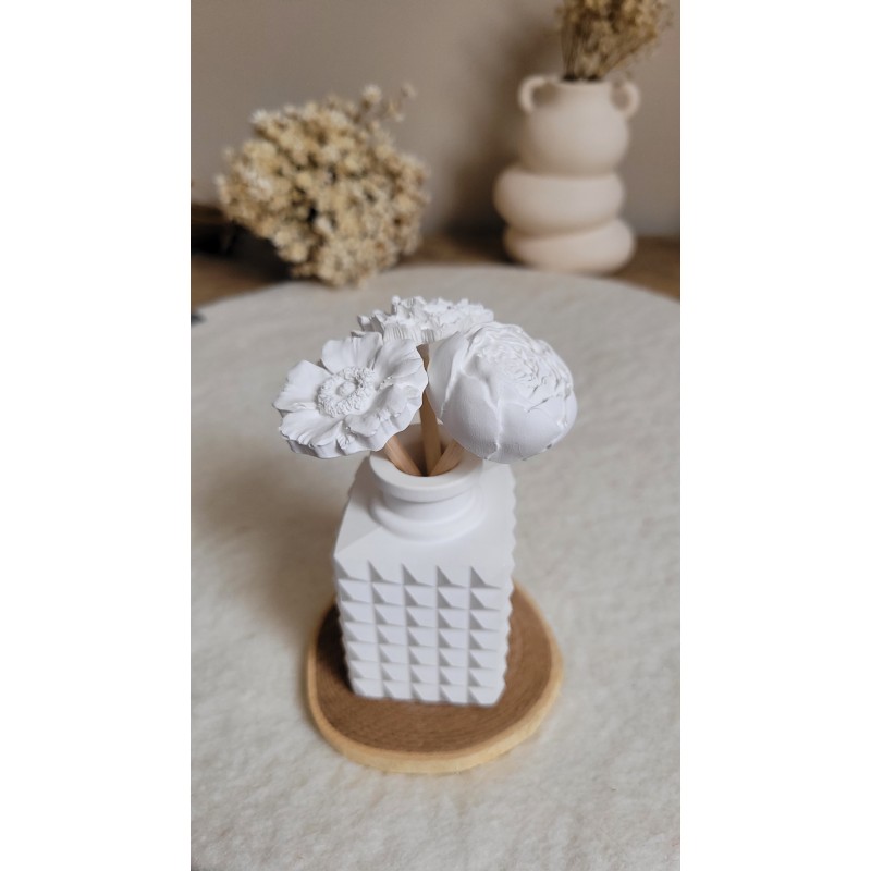 Attendre que le parfum s’imprègne par capillarité à travers le vase et les tiges de roseaux ornés de plâtre, libérant ainsi un doux parfum.
