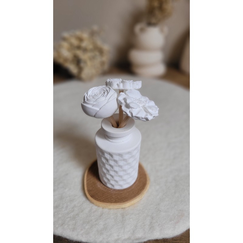 Attendre que le parfum s’imprègne par capillarité à travers le vase et les tiges de roseaux ornés de plâtre, libérant ainsi un doux parfum.